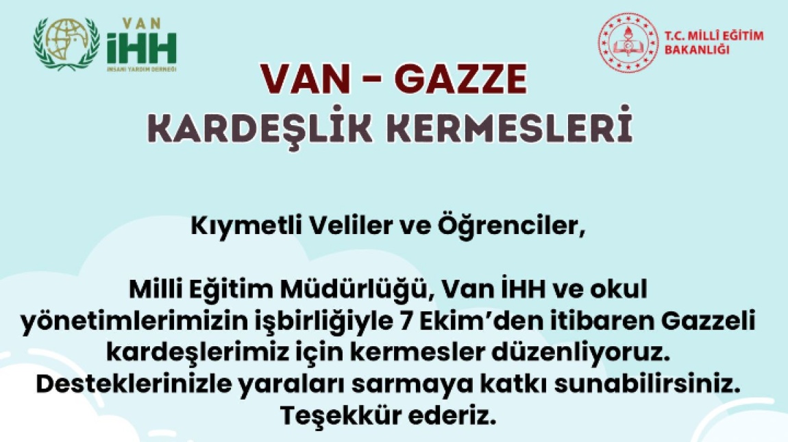 Milli Eğitim Müdürlüğü, Van İHH ve okul yönetimlerimizin işbirliğiyle 7 Ekim'den itibaren Gazzeli kardeşlerimiz için kermesler düzenliyoruz. Desteklerinizle yaraları sarmaya katkı sunabilirsiniz.